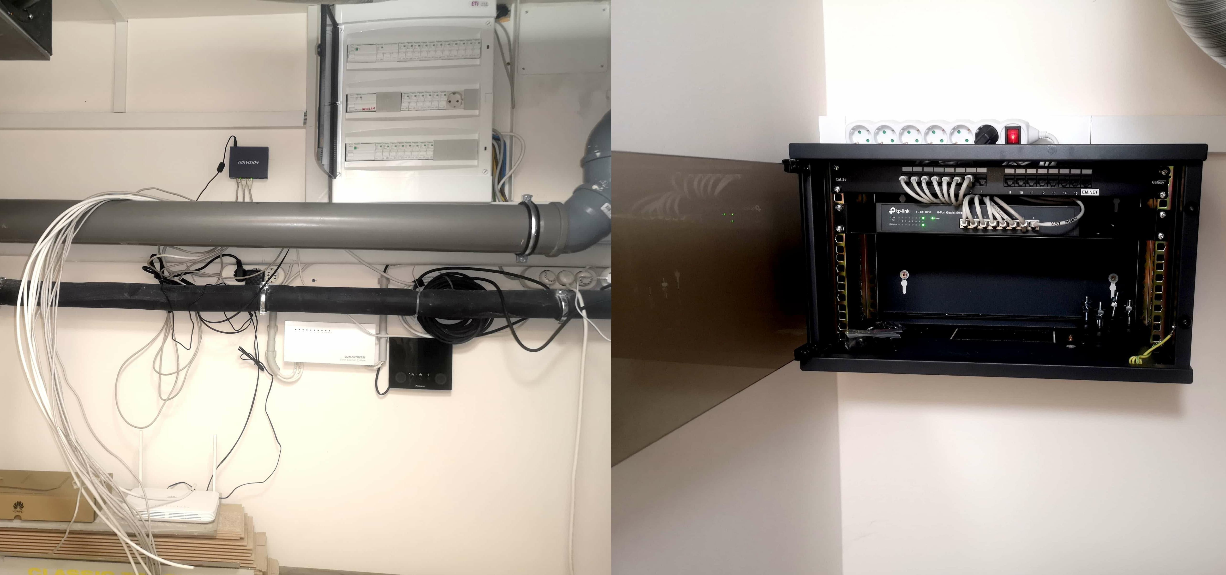 - Hálózati eszközök és kábeleik kulturált elrendezése (rackszekrény hiányában)